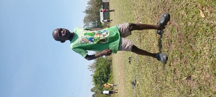 The scene depicts an outdoor setting in Kisumu, Kenya, under a clear, cloudless blue sky, illuminated by direct sunlight