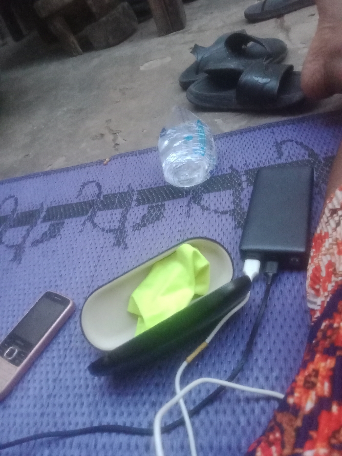 The image displays a ground-level view of various personal items arranged on a purple woven mat with a repeating dark anchor-like pattern, situated on a concrete floor in Hotoro North, Nigeria. In the lower-left, a light pink feature phone with a dark screen is present. To its right, an open, cream-colored eyeglass case holds a folded bright yellow microfiber cloth and partially contains a dark green cucumber that extends onto the mat. A black rectangular power bank, connected to both white and black charging cables, is positioned on the mat to the right of the eyeglass case. Above these items, slightly to the left, is a clear plastic bottle, approximately half-filled with water. In the upper-right corner, a pair of black slip-on sandals rests on the concrete floor, with a portion of a person's leg, clad in a red, orange, and purple patterned fabric, visible on the far right. The background features blurry wooden structures on the concrete floor.