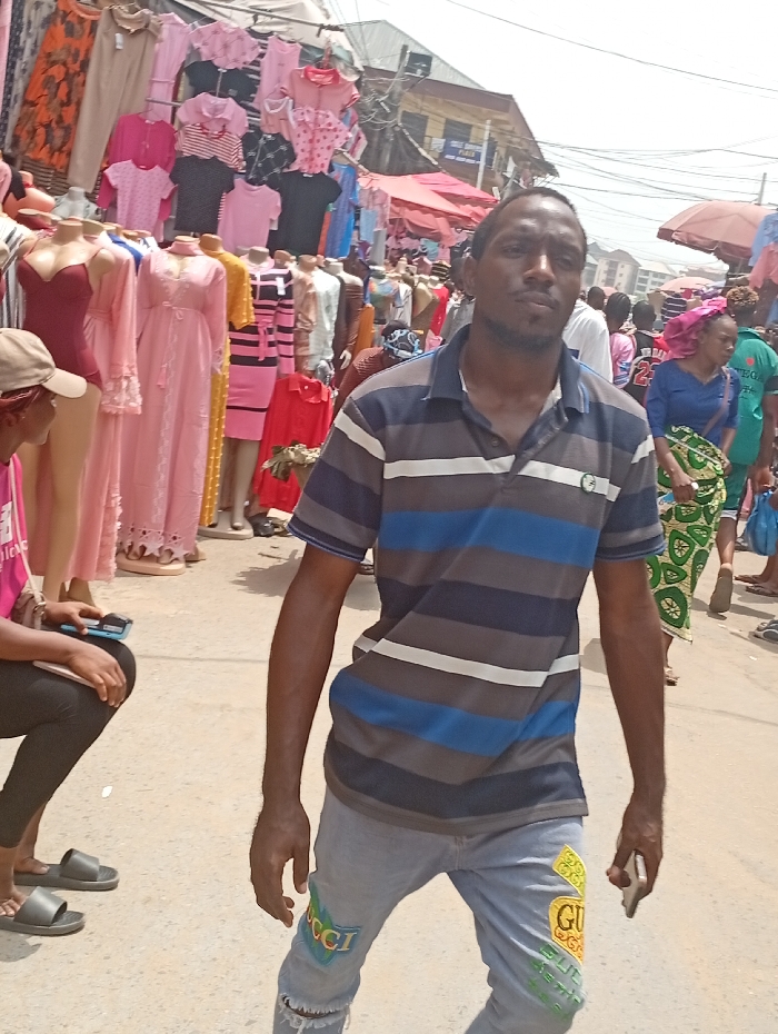 The image captures an outdoor market scene in Fegge, Nigeria, under bright daylight