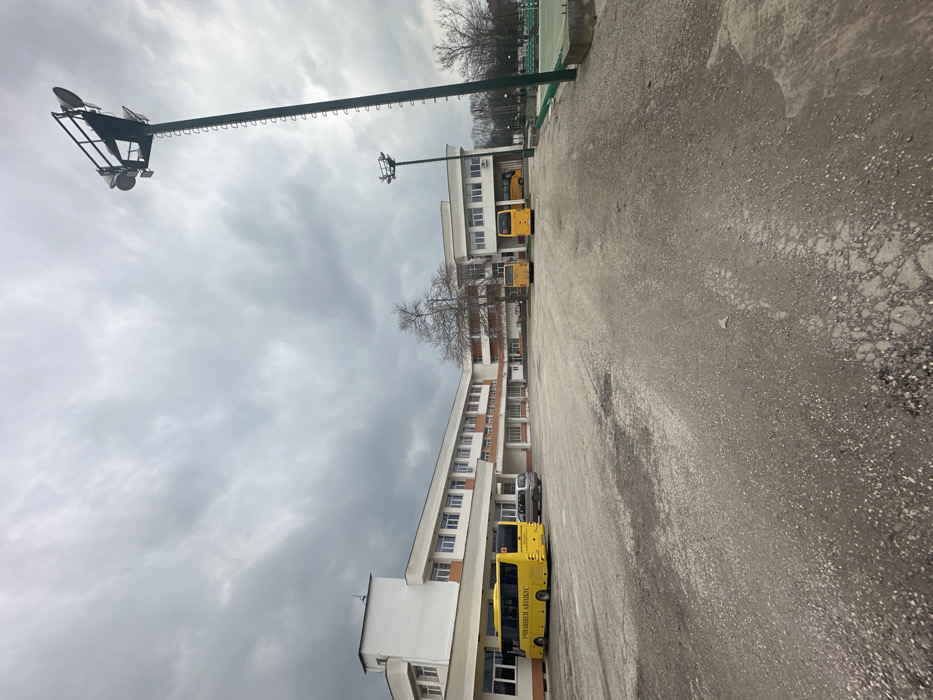 The image depicts an exterior view of a multi-story building and its surrounding grounds in Pordim, Bulgaria, under an overcast sky. The primary structure is a large, L-shaped building with white exterior walls and orange-brown accents, featuring numerous rectangular windows with dark frames. It appears to be a public or institutional building, possibly a school, given the presence of buses. In the foreground and midground, a large, uneven asphalt or gravel parking lot/courtyard dominates the scene. The surface exhibits cracks, wear, and patches of varied texture and color. Parked on the left side of the courtyard is a modern yellow school bus with "УЧИЛИЩЕН АВТОБУС" (SCHOOL BUS) written in Cyrillic on its side. Adjacent to it, a silver-grey minivan or utility vehicle is parked. Further right, closer to the building, two additional yellow buses are partially visible. A prominent, tall dark green metal floodlight pole with multiple round light fixtures and an integrated ladder stands on the right side, extending high into the frame. A shorter, similar floodlight pole is visible further behind it. To the immediate right, a section of a green-surfaced sports court, likely a tennis court, with white boundary lines and a green perimeter fence, is partially visible, bordered by a concrete curb. A large, leafless deciduous tree with bare branches stands in the central midground, in front of the building. Other bare trees are visible in the distant background, particularly near the sports court. The sky is entirely covered with dense grey clouds. No individuals or active interactions are present in the scene.