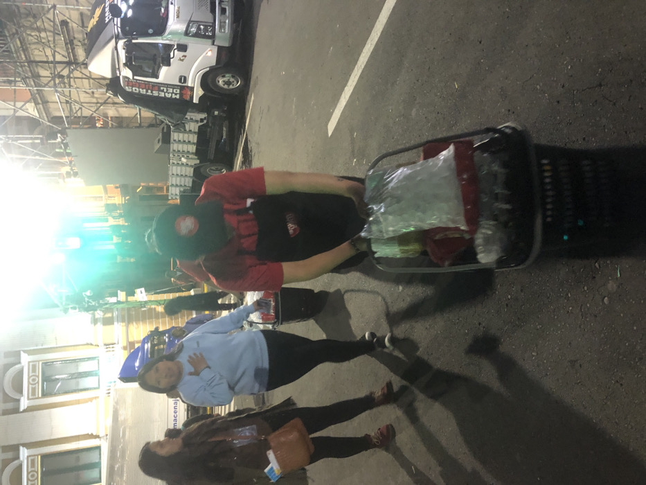 A man in a red shirt and black apron pushes a shopping cart containing goods covered in plastic wrap. Two women stand nearby. One woman wears a light blue top and black pants, while the other wears a brown jacket and black pants. A large truck with the words "MAESTROS DEL" is visible in the background. The setting appears to be an outdoor parking area at night, illuminated by bright lights.