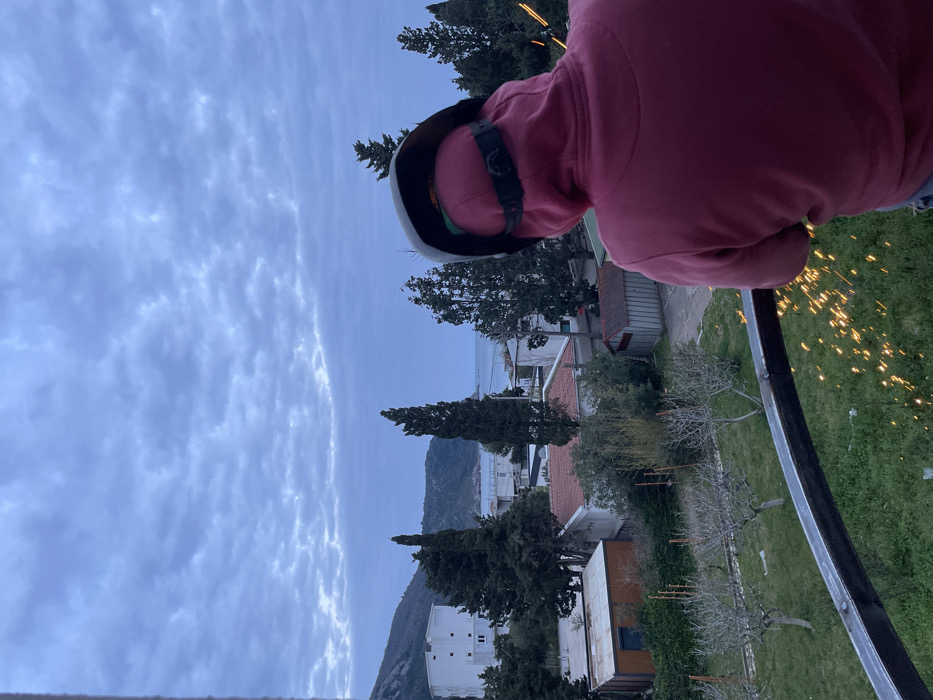 An individual, viewed from the back, wearing a dark red hooded sweatshirt and a welding helmet, is observed engaging in metalwork on a curved, dark metallic railing. Bright sparks emanate from the point of contact, descending towards a grassy area below. This area features several leafless trees and green shrubbery. In the midground, residential structures with white facades and red-tiled roofs are interspersed with tall, dark green coniferous trees. A light brown container-like building with a blue door and a small wooden shed with a red roof are also present. The background reveals the calm, dark blue waters of the Adriatic Sea, with distant mountains defining the coastline under an overcast sky filled with stratocumulus clouds. The scene is located in the city of Čanj, Montenegro.