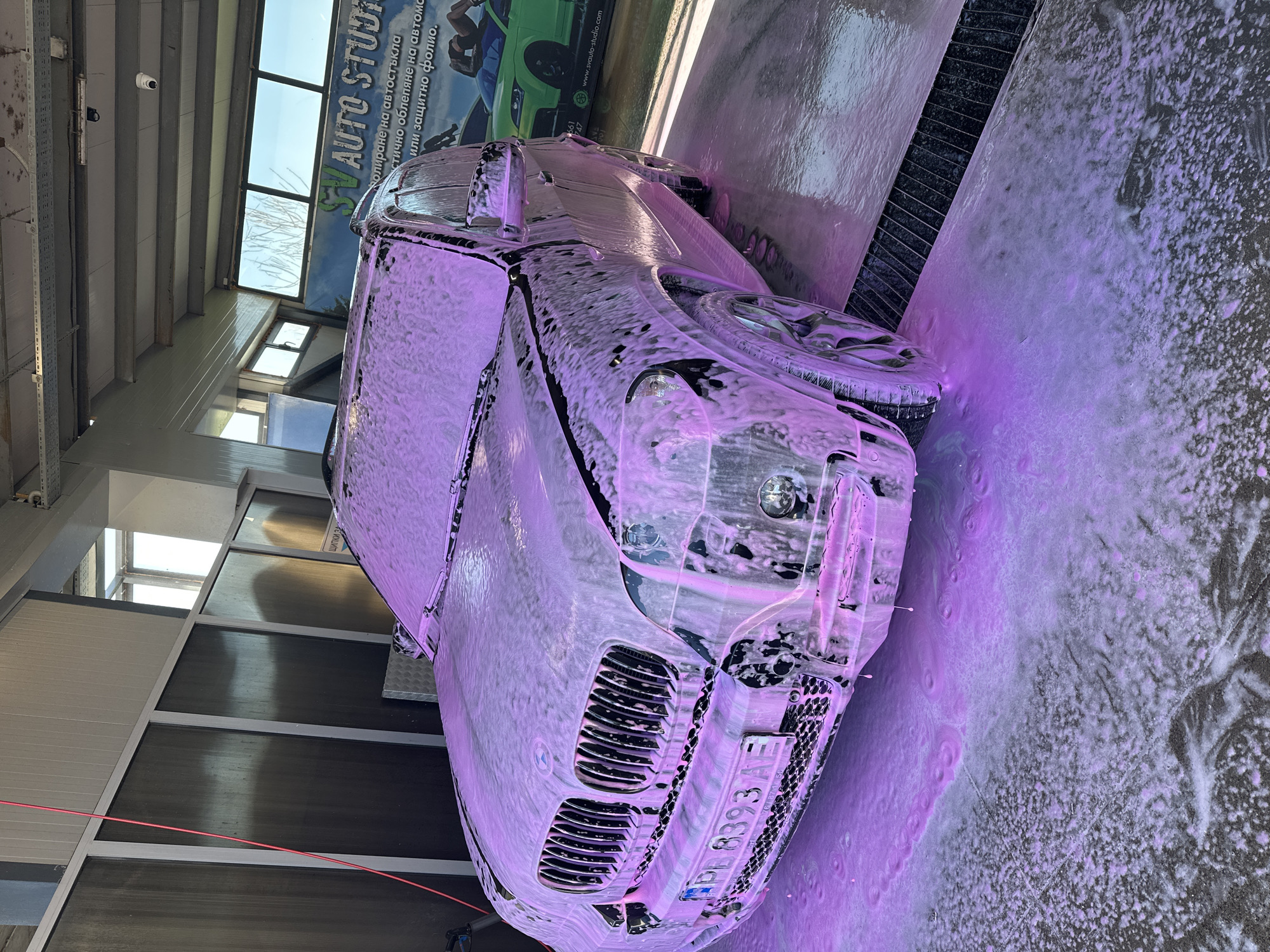 A car covered in purple foam is in a car wash. The car's license plate reads "PB 8393 AE," indicating that it is likely in Plovdiv, Bulgaria. The car wash is "SV AUTO STUDIO," as indicated by the signage in the background, which also advertises services such as polishing car windows and applying protective film. The environment appears to be an indoor car wash facility with overhead lighting and drainage.