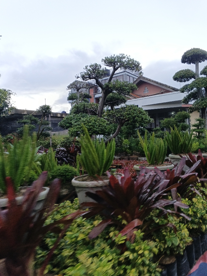 The image depicts an outdoor plant nursery or landscaped garden in Stueng Saen, Cambodia, under an overcast sky. In the background, a multi-story building with a reddish-orange tiled roof section and a lighter upper facade featuring a flat roof or balcony is partially visible through and above dense foliage. A concrete wall or barrier is also present on the left side of the background. The midground is dominated by numerous sculpted trees resembling large bonsai or topiary, characterized by thick, gnarled trunks and meticulously pruned, rounded green canopies. The foreground features an array of potted plants: several large, light grey cylindrical pots contain upright, spiky green plants, while other prominent plants display broad, dark red to maroon foliage. Smaller plants with variegated green and yellow leaves are visible as ground cover, and black plastic nursery bags containing young plants are discernible at the bottom right. No individuals, actions, or direct interactions are visible within the scene.