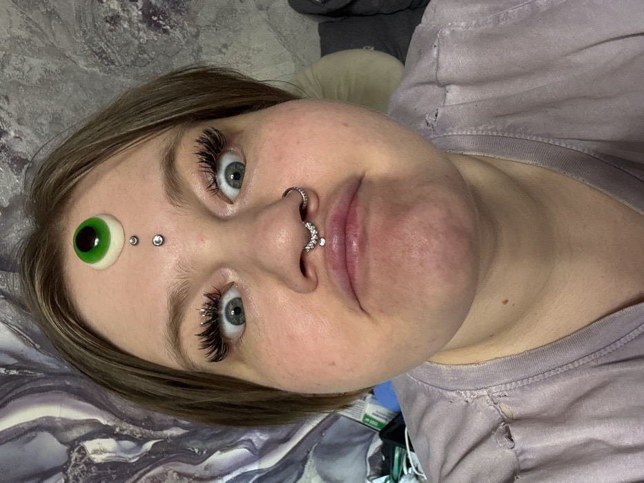 A close-up, frontal portrait shot captures a single human subject, appearing to be an adult female, in an indoor setting identified as the city of Saratov, Russia. The subject has short to medium-length brown hair and a pale complexion. Her eyes are wide open, displaying blue irises and prominent whites, complemented by long, dark eyelashes. On her forehead, a green and white eyeball-shaped candy is affixed centrally, positioned above two vertically aligned dermal piercings, each featuring a small silver-colored stud. Her nose is pierced with an ornate, gemstone-studded septum ring and a simple hoop in the right nostril. Her lips are pursed, and a philtrum piercing with a clear gemstone is visible above the upper lip. The subject is wearing a light lavender or faded purple t-shirt with visible tears or distressing on the left shoulder. Her facial expression is characterized by wide, staring eyes and a pursed mouth, directed towards the camera. The background consists of a patterned wallpaper with a grey and white marbled design. Partially visible to the right is a light-colored cushion or pillow, and to the left, blurred objects suggest a cluttered surface. The lighting is frontal and even, illuminating the subject's face.