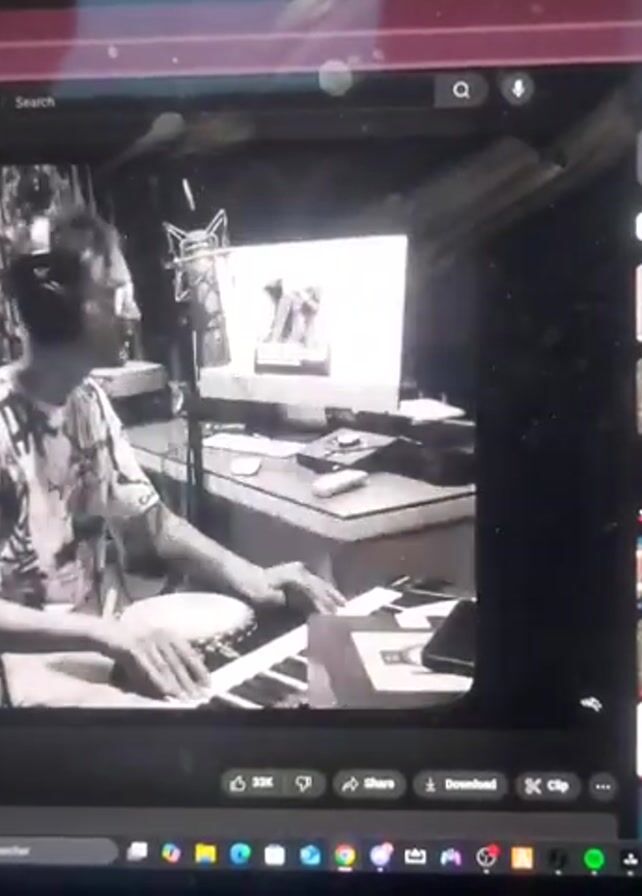 The video depicts a man in a music studio playing a keyboard and bongo drums, captured in black and white