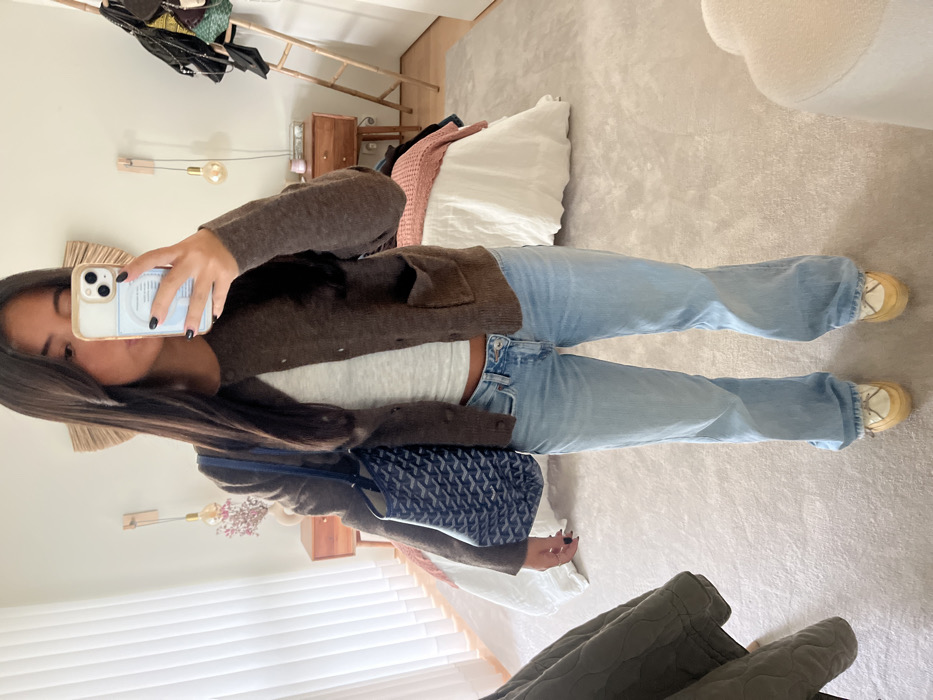 A young female, with long dark brown hair and bangs, stands in what appears to be a residential bedroom, taking a mirror selfie. She wears a dark brown button-up cardigan, a light-colored cropped tank top, light wash low-rise jeans, and tan sneakers. A dark blue tote bag with a geometric pattern is slung over her left shoulder. She holds a light-colored smartphone with a clear case in her right hand, obscuring her face, and her fingernails are painted black. The room features light beige carpeting, a pale green wall on the left, and an off-white wall on the right. In the background, a bed with white linen and a pink throw blanket is visible. Two wooden nightstands flank the bed, adorned with decorative lights and dried floral arrangements. A woven wall hanging is above the left nightstand. To the far right, a wooden ladder-style rack holds clothing. To the far left, a dark green quilted garment is partially visible. The precise location within Lordelo do Ouro e Massarelos, Portugal, cannot be determined from the provided visual information, beyond it being an indoor residential setting.