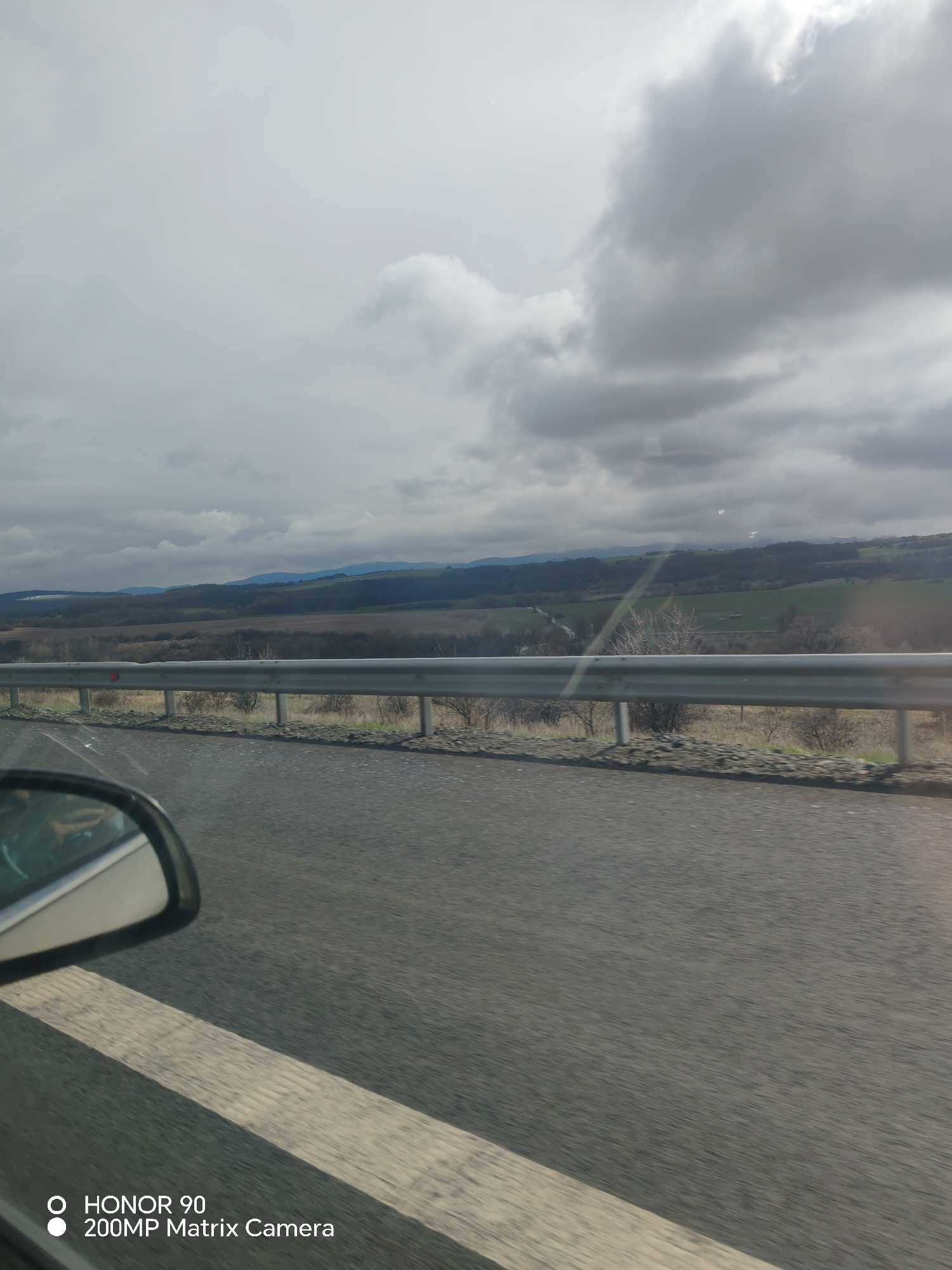 The image presents an exterior view from a moving vehicle, likely in the area of Vakarel, Bulgaria. The immediate foreground features a dark asphalt road with a wide, white lane marking or shoulder edge, exhibiting motion blur indicative of forward travel. A portion of a dark grey vehicle side mirror is visible in the bottom-left quadrant, reflecting interior elements. Across the midground, a silver-colored metal guardrail, composed of horizontal bars and vertical posts, spans the frame. Beyond the guardrail, the landscape extends into rolling terrain with agricultural fields, some appearing brown and tilled, others covered in sparse green vegetation or bare deciduous trees. Distant hills or mountains, partly covered in dense vegetation and possibly snow on the far left, define the horizon. The sky is largely overcast with prominent grey clouds, interspersed with brighter patches and faint sunbeams, particularly in the upper right. No individuals are visible. A digital watermark "O HONOR 90 200MP Matrix Camera" is present in the bottom left corner.