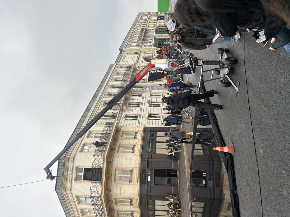 The image depicts an outdoor film set located on a street in Pommeuse, France, under an overcast sky. The scene features a row of multi-story buildings with light-colored, ornate facades, wrought iron balconies, and ground-floor commercial establishments, mimicking Parisian architecture. A large, red and black "MANITOU" brand telehandler, equipped with a camera rig or lighting, extends its boom from the right side of the frame towards the roof of a prominent corner building. A person stands on the second-story balcony of this corner building, observing the activity. On the asphalt street pavement, a large, rectangular, artificial pool of black, reflective water is positioned, mirroring the building facade. Two orange traffic cones are placed near the edge of this water feature. Numerous individuals, identified as film crew members, are scattered across the street. One individual, wearing a dark puffer jacket, walks in the foreground next to a four-wheeled camera dolly. Other crew members are engaged with various equipment, including lighting stands visible near the telehandler. Several individuals are seated at small, round tables with chairs outside a ground-floor establishment, likely a cafe, at the base of the corner building. In the distance, a large green screen is visible at the end of the street, indicating visual effects work. Cables and black fabric are present on the ground.