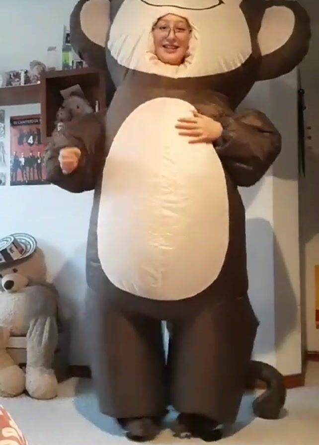 A person with glasses is standing in a room, wearing an inflatable monkey costume and dancing to music
