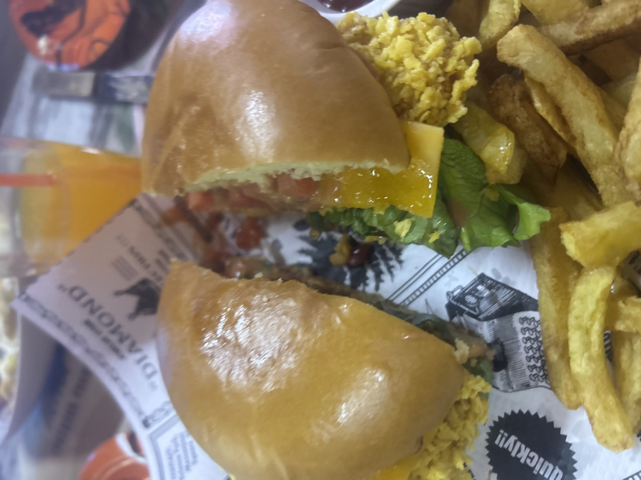 The image displays a close-up, elevated view of a burger meticulously cut in half, positioned on a printed paper liner and surrounded by French fries. The burger features glossy, golden-brown brioche buns. Its exposed interior reveals layers including green lettuce, a slice of melted yellow cheese, a textured golden-brown patty composed of what appears to be crispy fried components (possibly chicken or a plant-based alternative), diced red tomatoes, and a visible orange-yellow sauce. Numerous golden, thick-cut French fries are scattered across the foreground and around the burger. The food rests on a white paper liner printed with black text and graphics, including the word "DIAMOND" beneath a crown emblem, and a partial "quickly!!" visible. In the upper right background, a clear glass containing an orange beverage with a red straw is visible and out of focus. A blurry white dish is partially visible in the upper left background. The scene is illuminated by indoor ambient lighting. No individuals are present in the frame. There are no discernible visual elements within the image that specifically identify the location as Svishtov, Bulgaria.