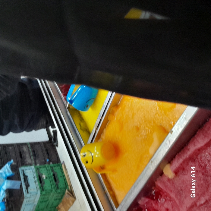 Seen from an overhead angle, a refrigerated display case holds three flavors of gelato. A pale red gelato fills the rightmost container. The container to the left holds bright yellow gelato and a matching yellow gelato scoop with a smiley face on the handle. A blue gelato scoop rests in the container holding a paler yellow gelato on the left. Stacked green crates are visible in the background, along with a person wearing a black glove and jacket.