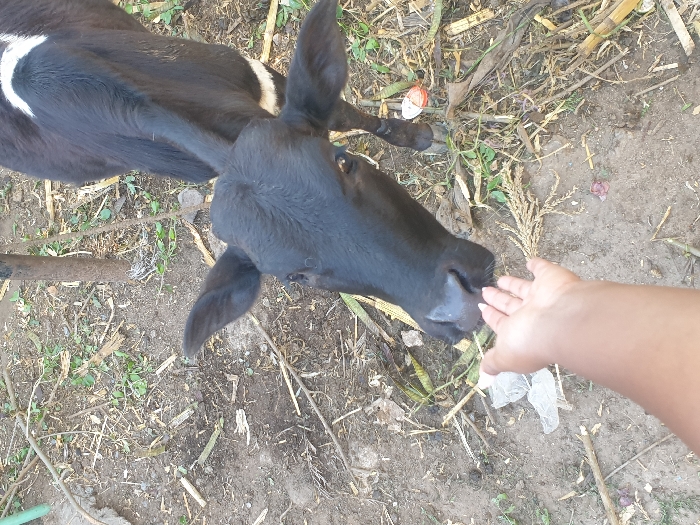 - "The image captures a black calf at ground level, interacting with an extended human hand in Mua ward, Kenya" by FM-Sr2Ad2, licensed under CC BY 4.0