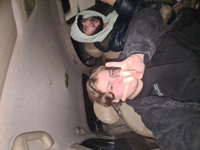 Two young men are in a vehicle. One with light brown hair makes a peace sign toward the camera. He's wearing a black shirt and dark denim jacket. The other man has dark hair and a beard, and is wearing a light green hoodie with a black jacket. The car's interior is tan colored. The photo is taken from a low angle and is rotated.