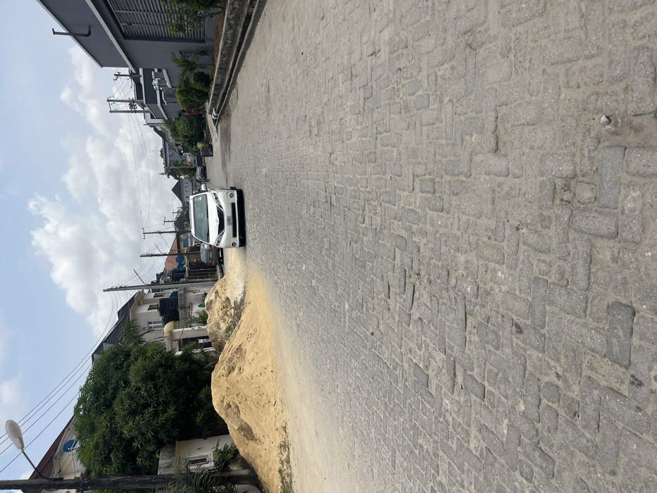 The image displays a paved street in Ojomu, Nigeria, under a partly cloudy sky. The road surface is constructed from greyish interlocking pavers, showing some wear and dirt. On the left side, two distinct piles of light brown sand are deposited on a dirt shoulder. Behind the sand are a large green tree and a white multi-story building with a dark roof. A utility pole with a street light and multiple power lines is visible on the left. A white Toyota Sienna minivan is positioned centrally on the road, facing away from the viewer, with a partially visible front license plate. Further down the street on the left, a dark-colored sedan is parked. On the right side of the street, a modern grey building with a textured facade is visible, set back from a raised curb containing green plantings. A single individual is discernible standing near the grey building on the right side in the mid-ground. Additional residential structures and indistinct vehicles are visible in the distance along the curving street.