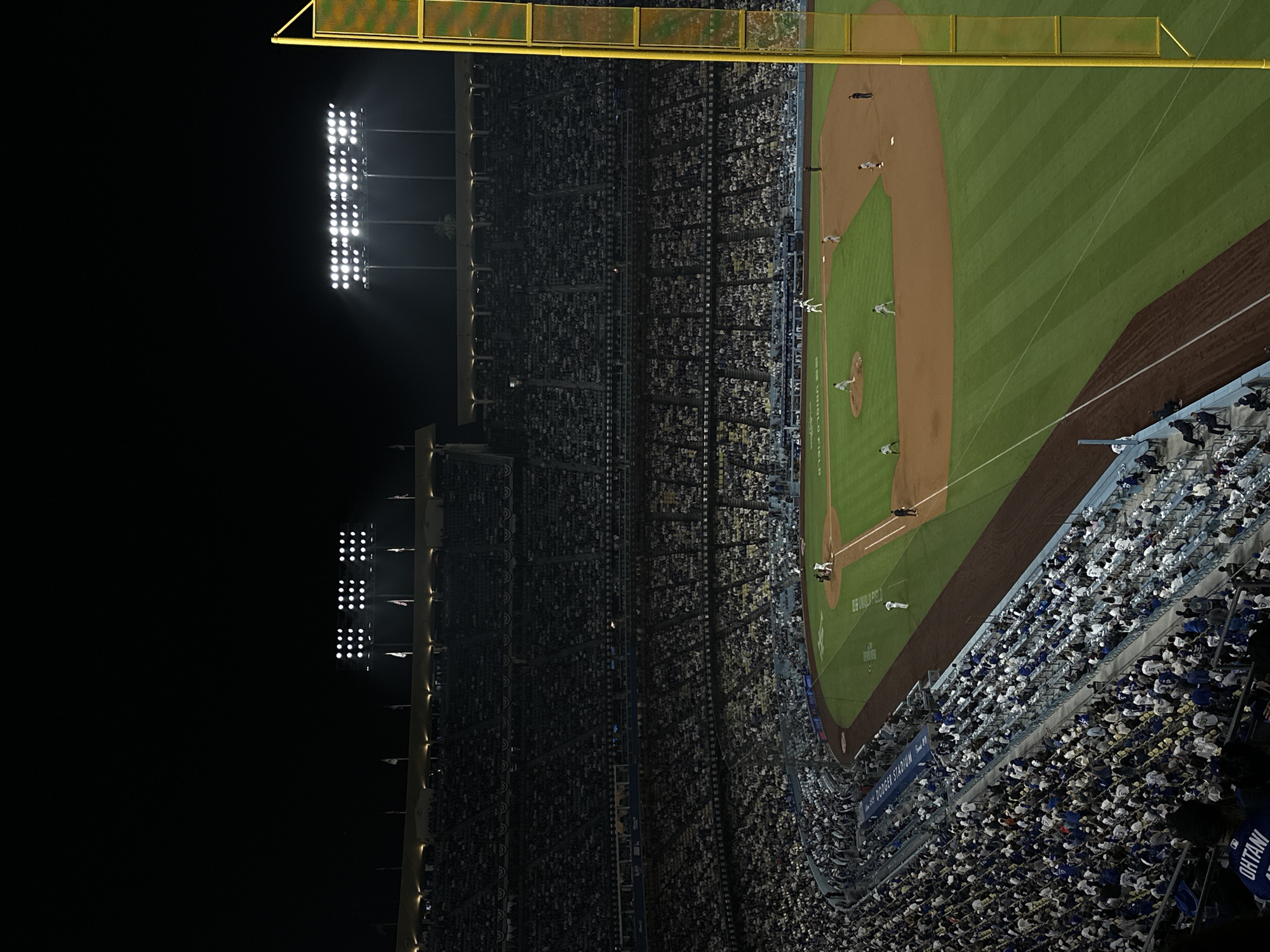 The image displays a wide, elevated view of a nighttime baseball game occurring at Dodger Stadium in Los Angeles, California, United States of America. The sky above the stadium is dark, illuminated by powerful arrays of stadium floodlights mounted on tall poles and along the upper deck structure. The baseball field, consisting of a green grass outfield and infield with brown dirt base paths and a pitcher's mound, is centrally lit. A player is visible at home plate, positioned as the batter, facing a pitcher on the mound. Other players are strategically placed across the infield, including near second base and first base. A prominent yellow foul pole stands vertically on the right side of the frame, marking the field boundary. The stadium's multi-tiered seating is largely occupied by a dense crowd of spectators, many wearing white and blue attire. Visible signage on a stadium wall within the seating area reads "DODGER STADIUM" and "UM UNIFO FIELD." Flags are also discernible along the top edge of the stadium's upper deck structure.