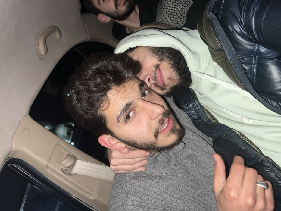 Three young men are clustered together in a car, likely in the back seat. The main focus is on the man in the foreground, wearing a gray sweater, gazing at the camera with a subtle smile. Behind him, another man in a pale green hoodie rests his head against the first man's. A third man is visible further back, though less clearly. The interior of the car, including the ceiling, handle, and safety belt fixture, can be seen in the background.