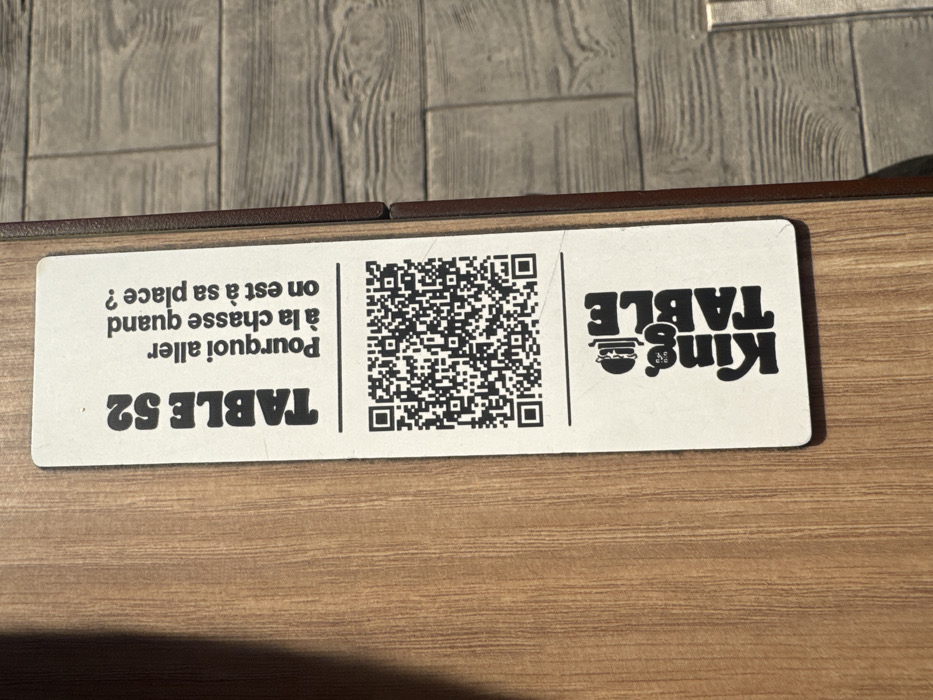 A white rectangular service marker is positioned on a light brown wooden table, which exhibits a vertical grain pattern. The marker displays black printed text: "TABLE 52" at the top, followed by the French question "Pourquoi aller à la chasse quand on est à sa place?" (Why go hunting when you're in your place?). Below this, a black and white QR code is visible. At the bottom of the marker, the "King TABLE" logo is present, incorporating a burger graphic above the word "King." The table surface shows minor wear. To the right of the table, a gray floor or adjacent surface with a horizontal wood-grain texture is visible. The scene is brightly illuminated by natural light. No individuals or dynamic actions are depicted. This setup is located within a Burger King restaurant in Ingré, France.