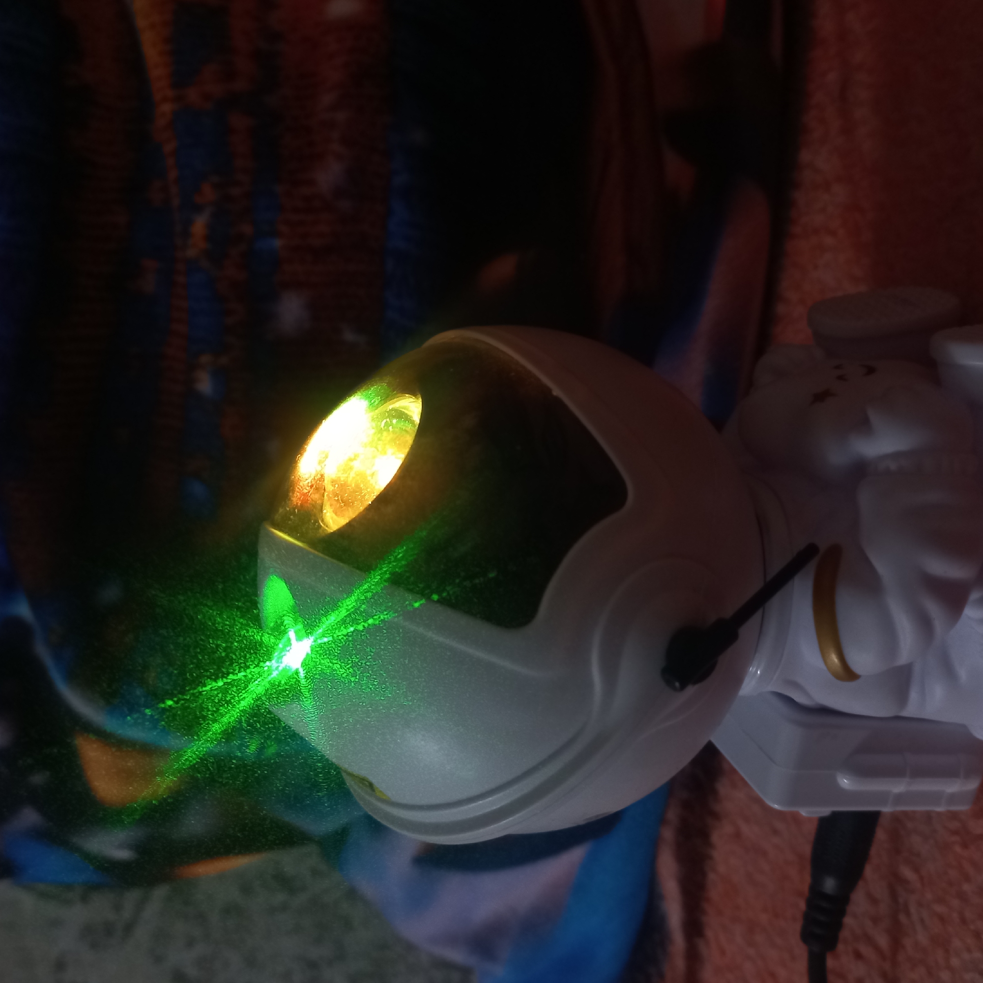 This image, captured in Kurganinsk, Russia, displays a white plastic astronaut-shaped projector in a dimly lit indoor setting. The projector is positioned on a reddish-brown textured fabric surface. It actively emits a bright green laser beam from its upper-left optical aperture and a distinct orange-yellow light from its upper-right optical aperture. A black cable is connected to the rear of the device, extending to the left. A small black antenna-like object is visible on the upper left side of the projector's helmet. A thin gold band is present on its right shoulder, and subtle star and smiley face patterns are visible on its chest. The background consists of blurred fabric exhibiting shades of blue, red, and dark tones. No individuals are present in the frame.