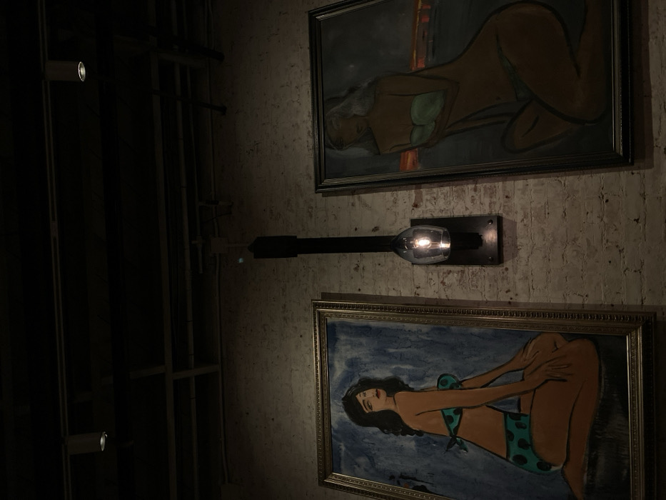 Two framed paintings of reclining women in bikinis adorn a brick wall. A sleek, modern light fixture with a clear glass shade and a black metal arm is positioned between the paintings. The left side of the frame showcases dark metal pipes against a dimly lit background. The paintings are vertically stacked, with the light fixture centered between them.