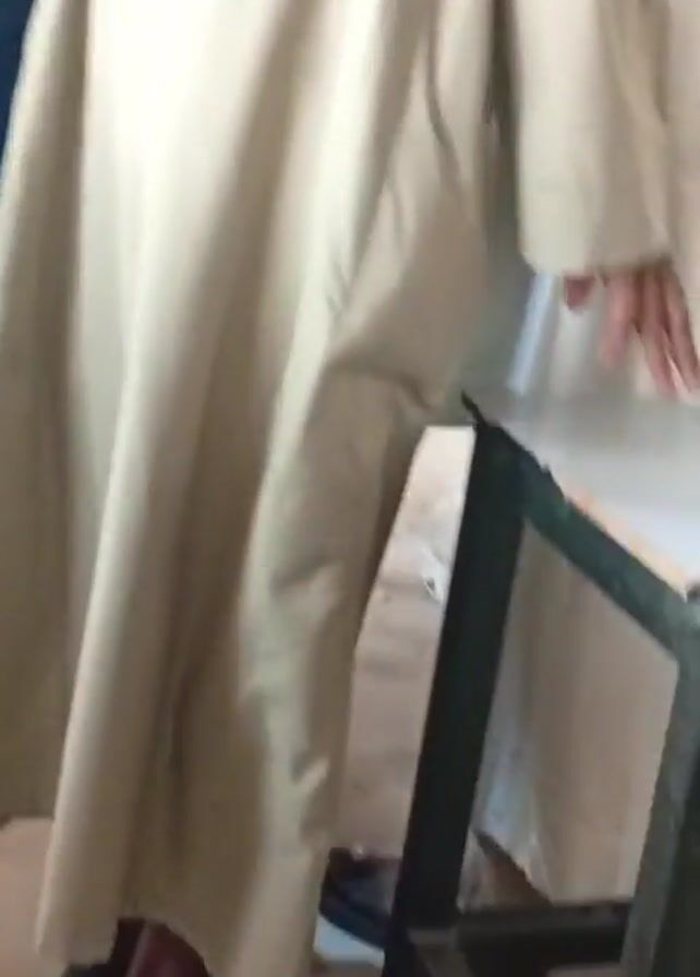A camera initially points down at a person's feet, shod in black shoes and wearing a light tan robe-like garment. The camera then angles up, revealing a man in the same garment, who turns to face the camera and smiles. The background includes other people, a white board, and a metal table.