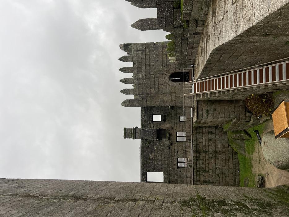 A stone castle with crenellations stands against a cloudy sky. Windows punctuate the lower section of the castle wall. A modern staircase leads up to an arched entrance. Moss and vegetation grow on the stone surfaces. A low stone wall extends into the foreground. A wooden structure is visible to the right.