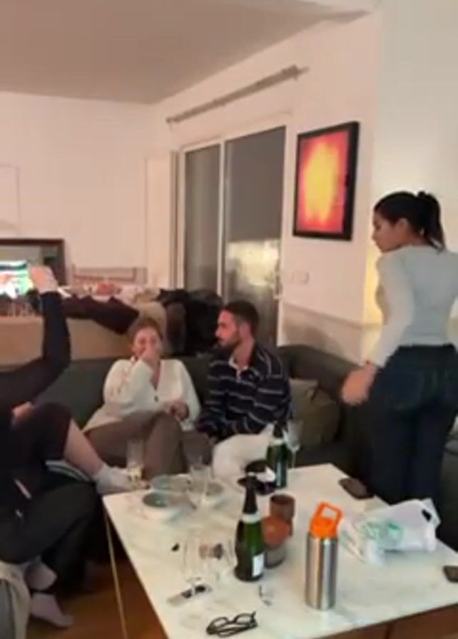 group of people in a living room setting, seemingly enjoying a casual gathering. Four individuals are seated on a grey corner sofa, while a woman stands near a marble-topped coffee table. One person on the sofa has their legs propped up. The woman standing appears to be talking or gesturing with her hands, possibly addressing the group. The coffee table is cluttered with several empty champagne bottles, champagne glasses, a water bottle, phones and other items. The room is brightly lit and also contains a glass patio door, an abstract art piece on the wall and a television.