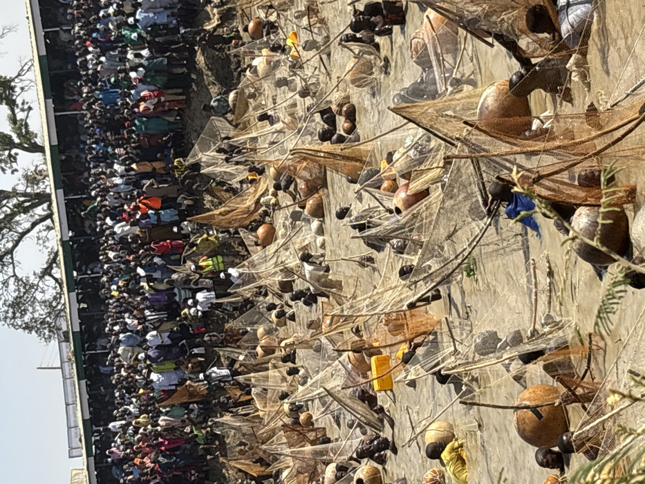 The image depicts a large communal fishing event taking place in Kokani North, Nigeria, under clear daylight conditions
