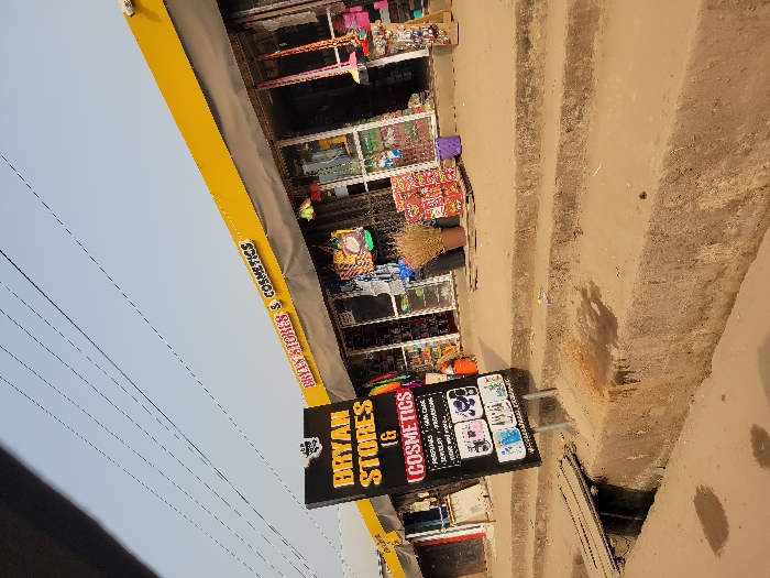 The image depicts a commercial street scene in Puerto López, Colombia, during daylight. A single-story building features a yellow-painted facade with an illuminated sign displaying "BRYAN STORES & COSMETICS". A black, freestanding sign on the unpaved ground to the left reads "BRYAN STORES 16 COSMETICS", listing items such as perfumes, skin care, jewelry, and promotions, with corresponding product images. The storefront consists of multiple glass display windows showcasing various retail items, including brooms with colorful handles, bags, and stacked boxes of merchandise. Two dark planters containing dried vegetation and a purple bucket are positioned on the ground outside the store. A concrete open-air gutter runs parallel to the building in the foreground, bridged by a wooden plank in the lower left. Beyond the gutter, a raised concrete walkway or series of steps leads to the store entrances. Numerous thin electrical wires crisscross against a clear, light blue sky overhead. No individuals are visible in the frame.