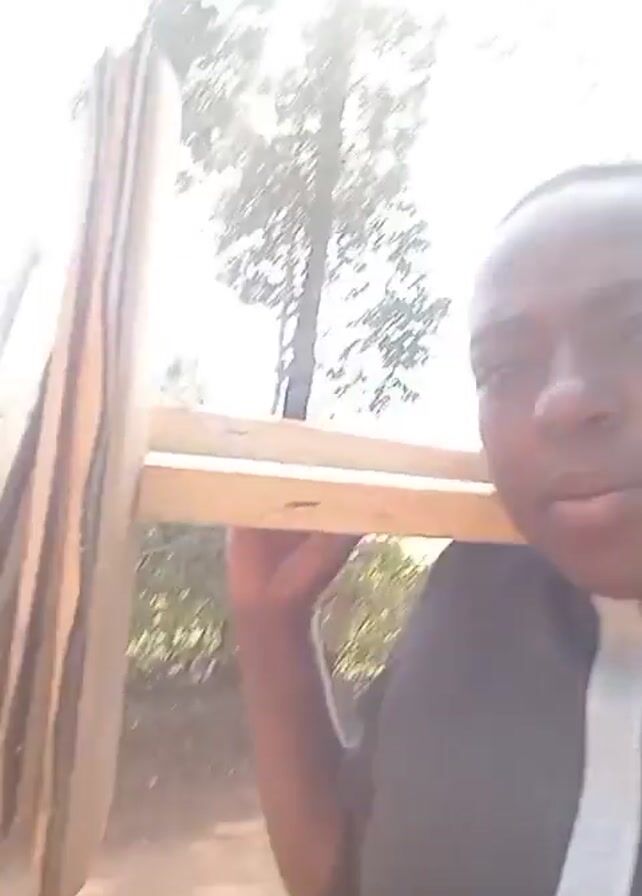 A person with short hair wearing a dark shirt with white stripes is carrying several planks of wood over their shoulder. The person is looking at the camera. The background includes trees and sunlight.