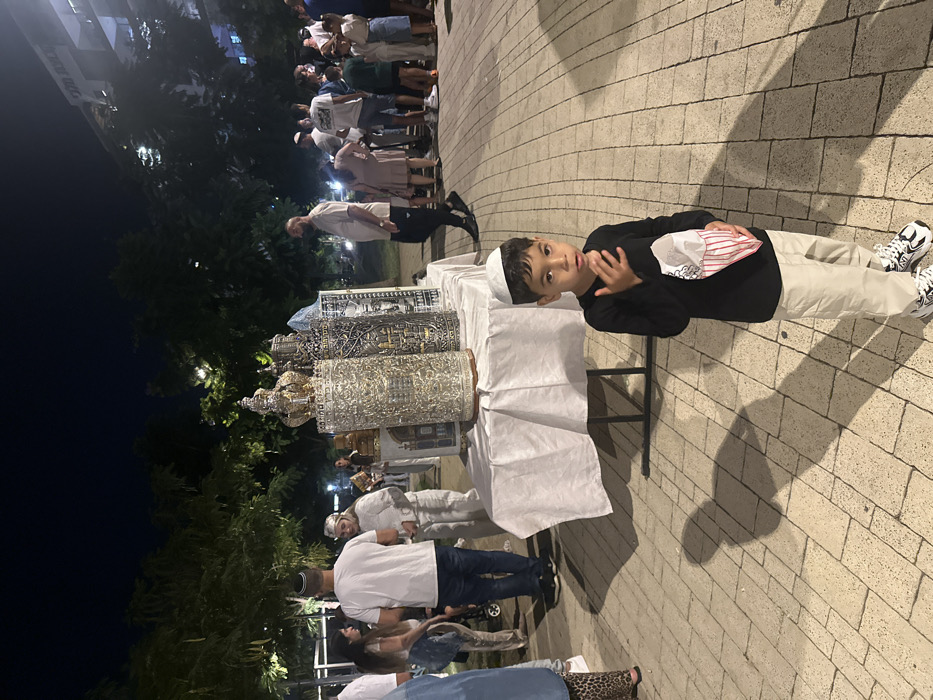 This image depicts an outdoor nighttime gathering in a paved urban area of Rishon LeZion, Israel. The scene is illuminated by artificial light, with a dark sky visible above. In the immediate foreground, slightly to the right, a boy, approximately 4-6 years old, stands facing the camera. He wears a white kippah, a long-sleeved black shirt, light beige trousers, and black and white athletic shoes. He holds a red and white striped paper cone in his left hand, while his right hand is near his mouth. His elongated shadow is cast on the light-colored paving stones towards the left. Central to the midground, a rectangular table draped with a white tablecloth displays three highly ornate Torah scrolls. These scrolls are encased in elaborate silver-colored coverings, two of which are surmounted by decorative crowns. The casings feature intricate designs and visible Hebrew text. Approximately 20-30 individuals are present in the scene, primarily adults, with some children. Many men are wearing kippot. On the left side of the table, a man in a white t-shirt and dark kippah is seen from the back, conversing with a woman. Further back on the left, another woman in light attire with a head covering is visible. On the right side of the table, a larger group of people is congregated, standing and observing. A man in a light t-shirt and dark pants walks towards the right. The background features trees with dark foliage against the night sky. On the far right, sections of a multi-story building with illuminated windows are visible. The ground is paved with rectangular light-colored pavers.