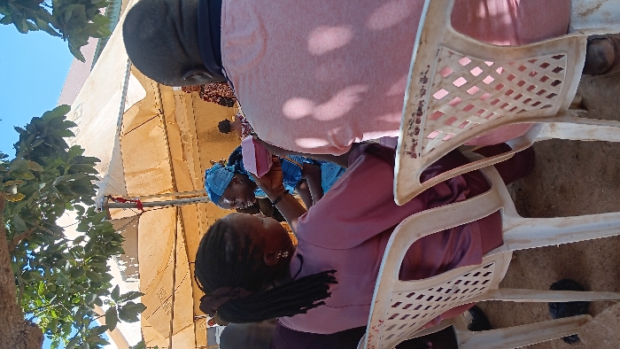 An outdoor scene in Kuru, Nigeria, depicts a gathering under a light-colored event tent and the partial shade of a tree. The ground consists of reddish-brown earth. In the foreground, two individuals are seated on white plastic chairs, with their backs partially to the camera. The person on the left wears a dusty pink long-sleeved garment and has dark braided hair tied in a high ponytail. The person on the right wears a light pink t-shirt, with leaf shadows cast upon their back. In the midground, a woman wearing a light blue headwrap and matching patterned attire smiles while holding a small, pink, two-toned bowl, extending it forward. Several other individuals are visible in the background, seated or standing beneath the tent, with one person wearing a brown and white patterned garment. The upper portion of the tent and supporting poles secured with red ties are visible, along with green tree foliage and a clear blue sky overhead.