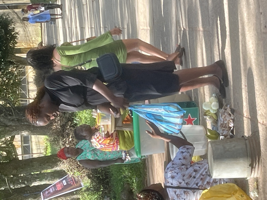 The image captures an outdoor street vending scene in Uturu, Nigeria, under direct sunlight. In the foreground, a dark-skinned woman with reddish-brown hair, wearing a black midi dress, black flats, and a black shoulder bag, stands facing left, looking downwards. She holds a blue and white striped plastic bag in her left hand, positioned towards a seated woman. A small, indistinct object is held in her right hand. The seated woman, partially visible from the back, wears a white and dark patterned top and a patterned head covering. Her right hand is extended, palm open and upwards, towards the standing woman. On the ground between them, a grey bucket is visible, along with a plate containing several white, peeled spherical items (likely onions), a bunch of yellow bananas, and other wrapped or loose items. Behind the central standing woman, to her right, another woman walks away, viewed from the back-left, wearing a light green, off-the-shoulder mini-dress and carrying a small light-colored bag. In the mid-ground, to the left, two women are positioned behind a vendor stall. One stands wearing a turquoise patterned top and a red headwrap. The other is seated, wearing a brightly colored, multi-patterned top and a light green skirt, behind a small table laden with containers, including a clear plastic cup. A large green cooler with a white lid and a green crate displaying a red and white Heineken logo are visible beneath the stall items. To the far left, a dark rectangular sign or poster leans against a tree. In the distant background, two individuals walk uphill on a paved pathway: one in a light blue garment, the other in dark clothing. A light-colored building with visible windows is present behind the trees and path. The ground is a paved surface, and strong shadows indicate bright, direct overhead sunlight.