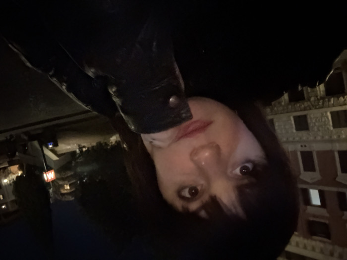 A person with dark hair and brown eyes faces the camera. They are wearing a dark jacket, and the background shows a building at night with lit windows. A street scene includes trees and a sign with the letter "W" in red. The perspective is rotated, causing the building to appear above the person.