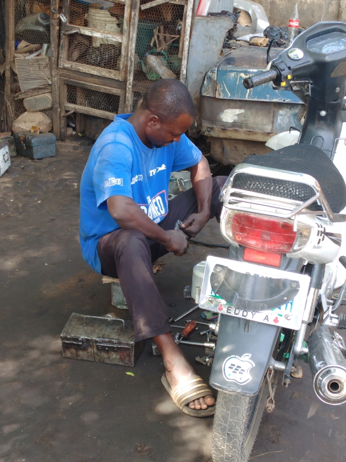 The image portrays an outdoor motorcycle repair setting within the city of Sardauna, Nigeria