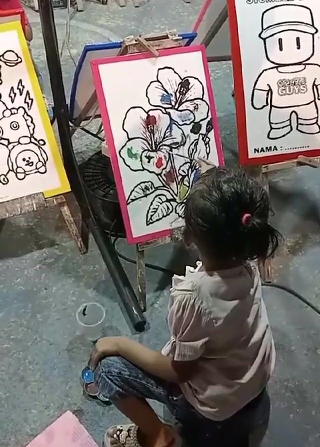 A young girl is sitting on a small stool, focused on painting a picture of flowers on a small canvas. The canvas is propped up on a mini easel with a pink frame. Around her are other easels displaying different coloring pages; one depicts characters from "Stumble Guys." The floor is gray and there is a small cup of water, a palette of paints, and a pink cloth nearby. She is wearing a light pink shirt, denim capri pants, and sandals. A black pole and a fan are also visible. The lighting is somewhat dim and appears to be indoors.