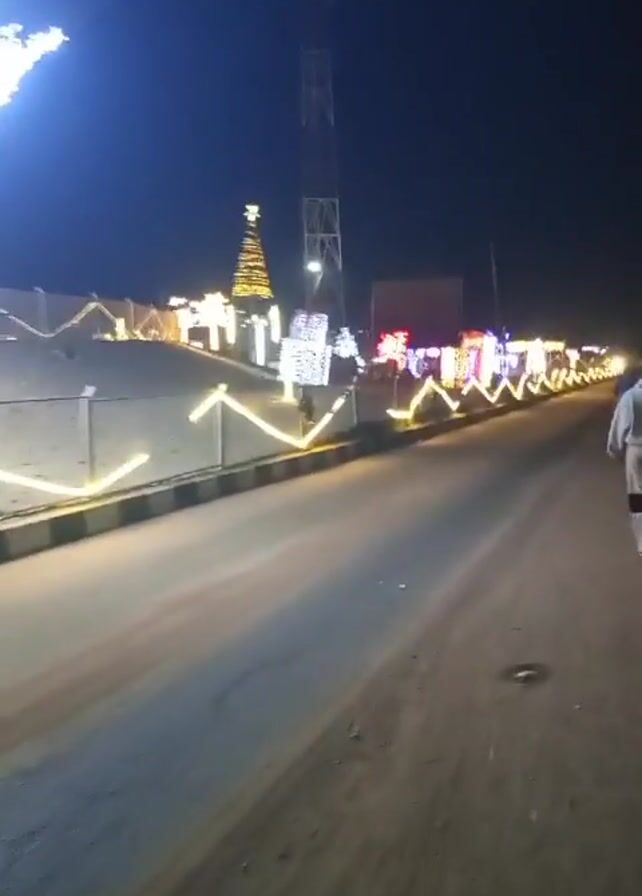 street decorated with Christmas lights at night. The camera follows the perspective of someone walking along the road, capturing the festive display. There's a Christmas tree lit up on the left, along with other illuminated decorations and what appears to be small tents. A tall communications tower stands behind the displays. People are seen walking ahead on the right side of the road. The road surface is rough and the lighting is dim aside from the Christmas decorations.