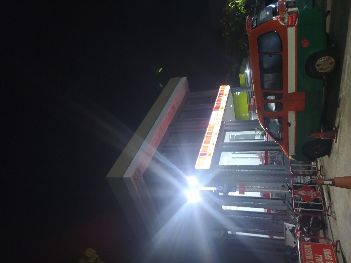 The image depicts a nighttime scene at a public fuel filling station (SPBU) in Bandung City, Indonesia