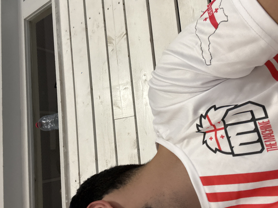 A partial view of an individual's upper torso and head is depicted indoors in Oberhausbergen, France. The subject, visible from the back of the head and right ear to the left shoulder, has short, dark hair. They are wearing a white, short-sleeved athletic shirt featuring red vertical stripes on the left side and a prominent logo on the chest. This logo consists of a black-outlined fist with "THE MACHINE" in red text below it. The top of the fist design incorporates a red cross on a white background. On the right sleeve, an outline of the map of Georgia, filled with the Georgian flag design (white with five red crosses), is visible, partially obscuring the word "GEORGIA". The background consists of a white wall constructed from horizontal wooden planks. Above the planks, a narrow, open horizontal space reveals a clear plastic water bottle with a red cap resting on a ledge within this opening. The area beyond the bottle is dark and appears to contain a mesh or grid.