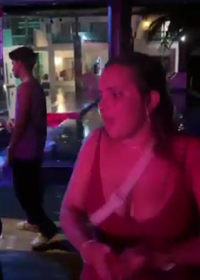 A woman in a low-cut red dress is dancing at night
