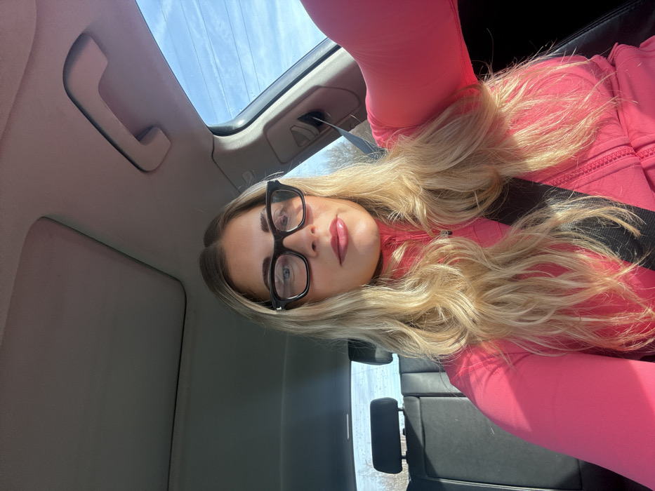 The image displays a female individual situated inside a vehicle, specifically in the city of Wasquehal, France, during daylight hours. The subject has long, wavy blonde hair and is wearing dark-framed rectangular glasses. She is dressed in a bright pink long-sleeved top with a quarter-zip collar. A dark seatbelt diagonally crosses her torso. Her lips are coated with pink lipstick. The vehicle's interior features a light-colored headliner, a visible sunroof, and an overhead grab handle located on the right side. Dark-colored rear seats with headrests are present behind the individual. Through the car's windows, a clear blue sky with faint cloud streaks and distant, possibly bare, trees or vegetation can be observed. The individual is looking directly towards the camera, suggesting a self-portrait.