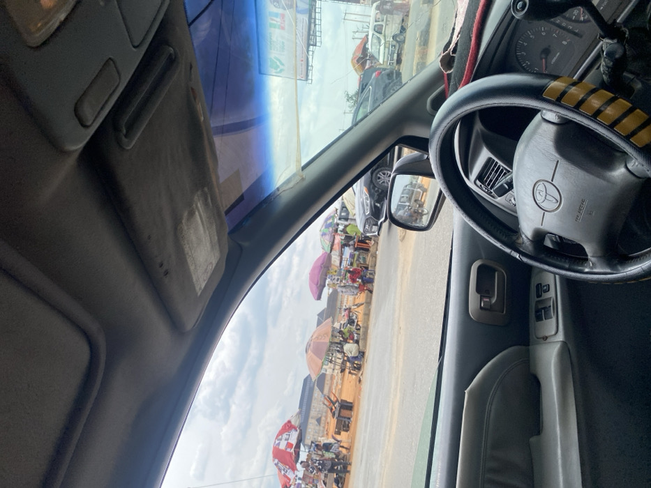 The image depicts a roadside scene in Naze, Nigeria, viewed from the interior of a vehicle, specifically from the driver's perspective. The foreground shows the vehicle's gray dashboard, a black steering wheel with a Toyota emblem and yellow-striped cover, the driver's side door panel with power window controls, and the rearview mirror reflecting a white van and a motorcycle. Through the windshield, a busy street scene unfolds under an overcast sky. Multiple informal market stalls are visible along the road, characterized by large, colorful umbrellas providing shade, including red and white striped, brown, pink, and multi-colored patterns. Numerous individuals, appearing to be vendors and customers, are present near these stalls, engaged in various activities. Objects like wooden tables, benches, and merchandise are discernible at the stalls. On the paved road, a dark-colored Hyundai sedan is parked or stationary in the midground, with other vehicles, including a white van, further down the road. The immediate roadside features patches of exposed dirt. In the background, behind the market activity, several low-rise buildings constructed with what appears to be reddish-brown bricks are visible.