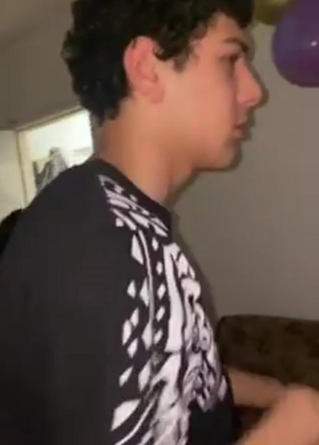 A short video shows a young woman in black pants and a black crop top, holding a mobile phone to film a young man with dark curly hair, wearing a black t-shirt, standing facing away from the camera, swaying and apparently dancing
