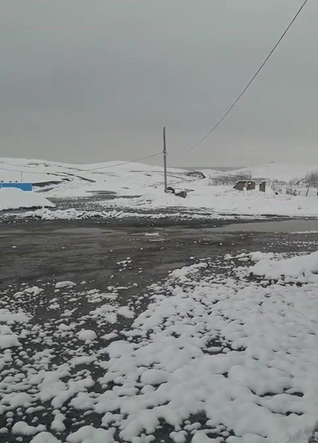 snowy landscape on a cloudy day. In the foreground, there's a partially snow-covered dirt ground. Further in the background, there are rolling hills covered in snow. A few structures are visible in the distance, including what appears to be a drilling rig. There is a single powerline.