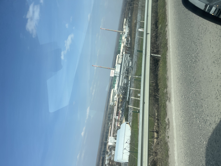 The image presents an elevated, wide view of the Kozloduy Nuclear Power Plant complex in Kozloduy, Bulgaria, captured from within a moving vehicle on a clear day. In the immediate foreground, a textured asphalt road surface is visible, bordered by a horizontal, two-tier metal guardrail. Beyond the guardrail, dry grass and sparse vegetation extend to a perimeter fence line, within which a large, white, semi-cylindrical tent-like structure is situated on the left. The midground and background are dominated by the industrial complex of the power plant, featuring numerous interconnected buildings of varying sizes and grey-white coloration. Two tall, slender chimneys, distinguished by alternating red and white horizontal stripes, stand prominently on the right side of the complex. A white informational sign, mostly obscured by distance, is visible near the base of the plant structures. The distant background consists of a flat, hazy landscape characterized by a dense, bare tree line. The sky above is a bright, clear blue with scattered small white clouds. Reflections on the vehicle's window are apparent across the upper and central portions of the image, and a portion of a car's side mirror is visible in the bottom right corner. No individuals are visible within the scene.