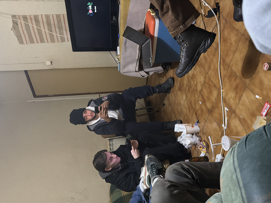 A group of people are gathered in a room, engaged in casual activities. Two individuals are prominent, with one engrossed in a phone and the other gesturing. A television displays a game, while a laptop rests on a cooler. The floor is cluttered with trash, including cups, wrappers, and discarded items. The overall atmosphere appears relaxed and informal.