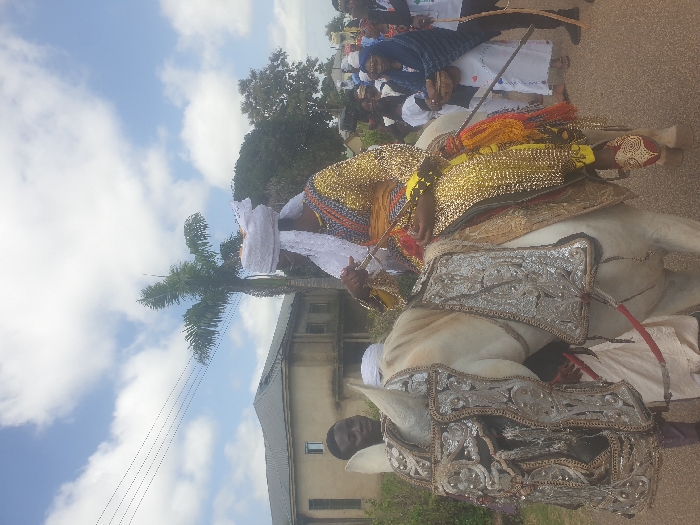 In Kaninkon, Nigeria, a light-skinned individual adorned in a shimmering gold, yellow, and orange regal garment with a white turban and facial veil is seated atop a white horse heavily decorated with ornate silver metallic barding covering its head, neck, and sides