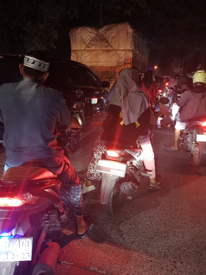 scene of a traffic jam in a city at night. The location is in Kecamatan Kaliwungu Selatan, Indonesia, based on the coordinates provided. The scene is lit by the headlights of vehicles. A man in a light blue shirt and a white and blue cap sits on a black motorcycle. There is a woman in a black jacket and gray headscarf sitting on another motorcycle. There are several other people in the background. All appear to be stopped in a traffic jam.