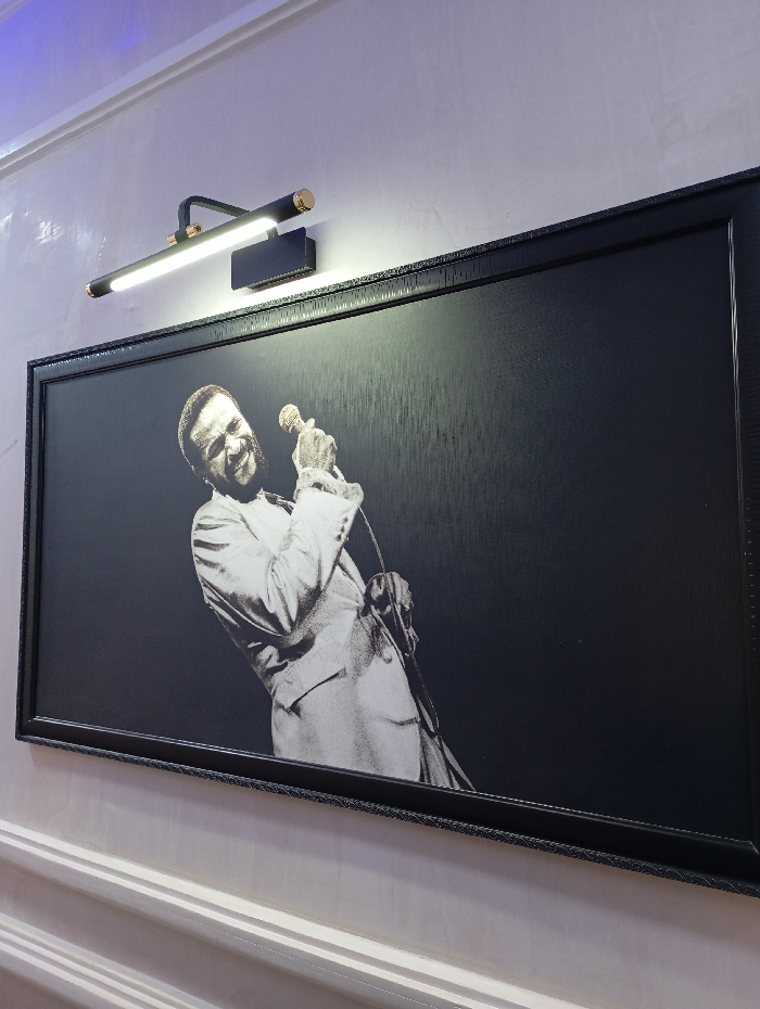This image captures an indoor scene in Jos, Nigeria, featuring a large, horizontally oriented framed artwork mounted on a light-colored wall. The artwork is a monochromatic depiction of a smiling male figure, presented in a suit jacket, holding a microphone in his right hand against a dark, plain background. The artwork is enclosed within a black frame featuring a textured or ornate border. Directly above the frame, a black linear LED picture light with gold-colored end accents is mounted, casting bright white illumination downwards onto the artwork. Below the artwork, a white decorative wainscoting or molding with multiple horizontal raised panels is visible along the lower section of the wall.