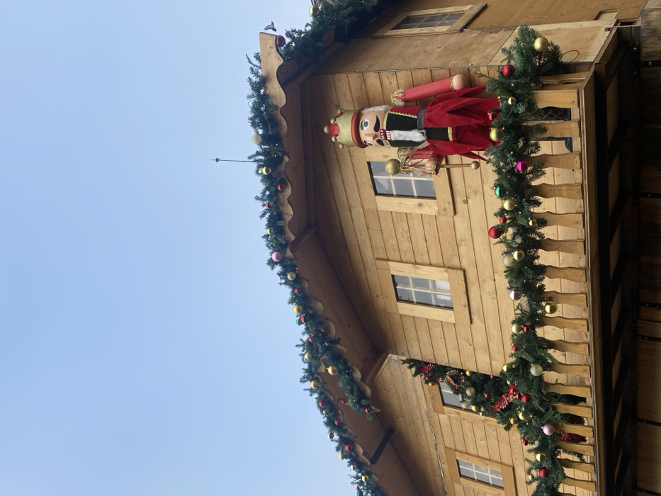 - "This image depicts a section of a festive, two-story, light brown wooden chalet-style building, likely part of a Christmas market in Strasbourg, France" by FM-LroJ22, licensed under CC BY 4.0